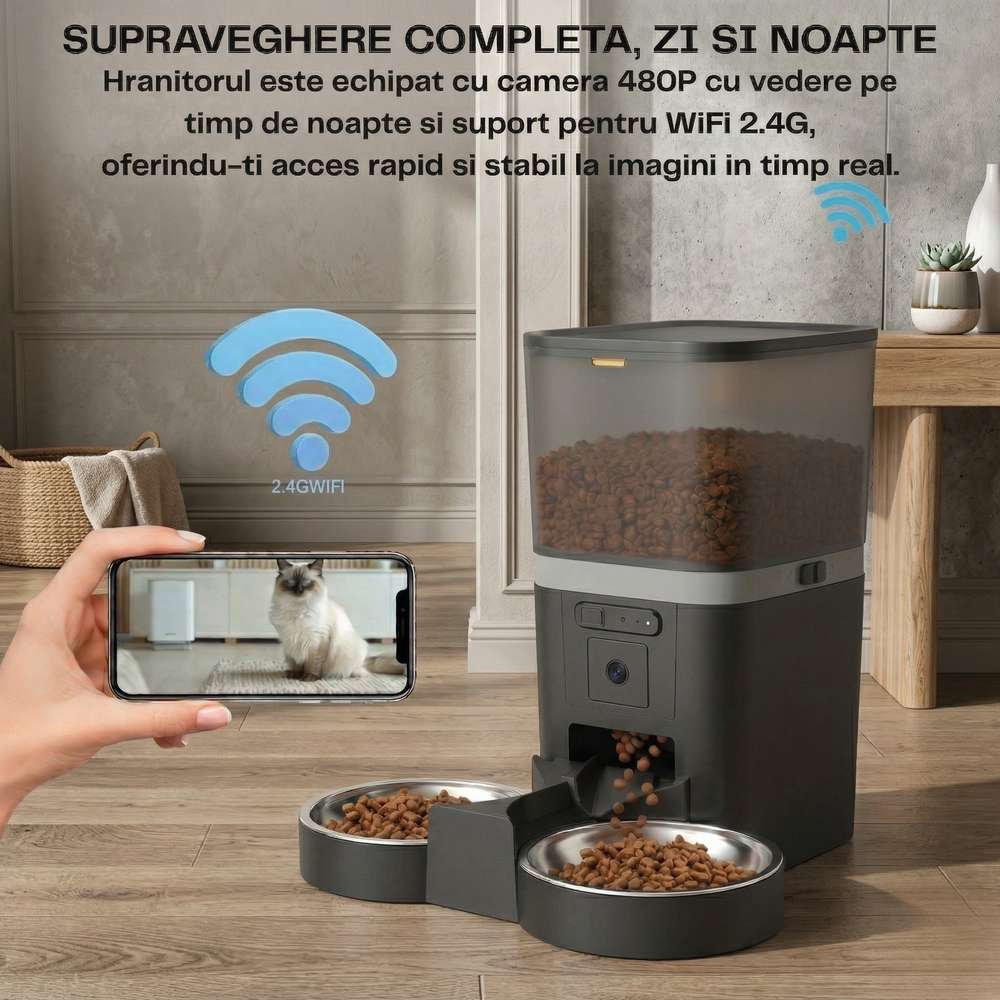 - Monitorizare Vizuală: Vezi oricând că animalul tău mănâncă.